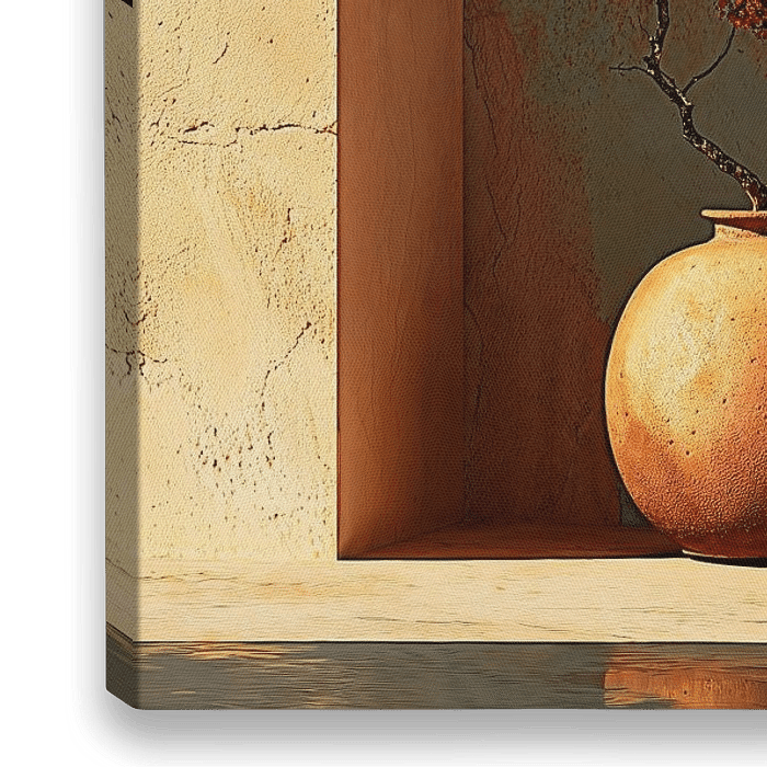 Een stilleven met een ronde terracotta vaas en een opvallende tak met felrode bladeren, die een sterk contrast vormt met de turquoise muur. Het zonlicht valt schuin naar binnen en werpt lange zachte schaduwen. De algehele compositie benadruk het samenspel van licht en kleur en straalt rust en harmonie uit.