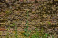 een muur van oude stenen met onkruidgroei erop.