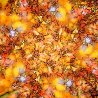 Een kleurrijk kaleidoscopisch beeld in rode, gele en oranje tinten, gemaakt door het vijf maal kopieren, roteren en mengen van een foto van beukenbladeren op een zonnige herfstdag.