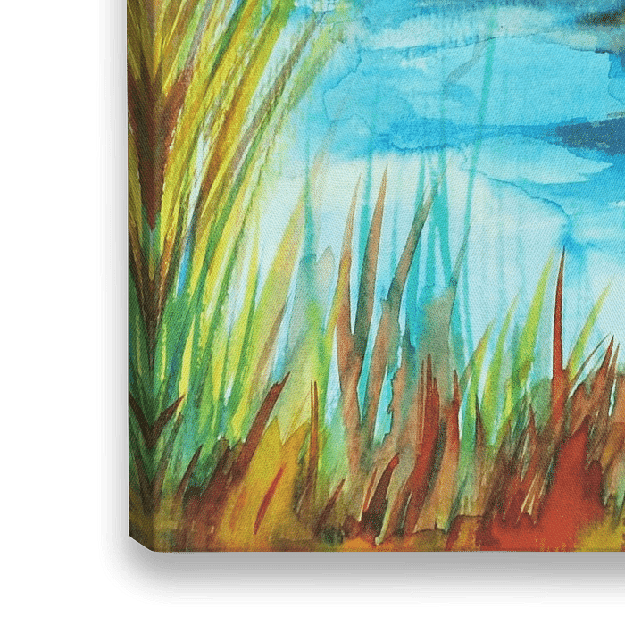 Impressie van een rivier, geschilderd met ecoline, met op de achtergrond een boompartij. De grassen aan de voorkant zijn geel bruin gekleurd. De kleuren lopen door elkaar heen en het geheel geeft een zomers gevoel. De zon gaat onder achter de bomen en de kleuren zijn warm en het geeft een gevoel van rust en kalmte.
