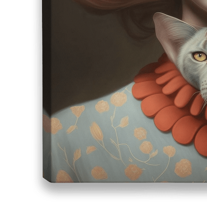 Digital art work met de titel: "This is us: my cat and me". Portret van een roodharig / blond meisje met klassieke kleding in pastelkleuren met in haar kraag een grijze kat met gele ogen. Contemporary art, woonstijl contemporary en design. Dit werk komt het best tot haar recht in groot formaat op artframe, acrylglas of dibond.…