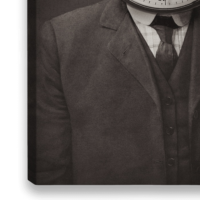 Vintage, surrealistische afbeelding in zwart wit met een vleug sepia. Man met zakhorloge. Of zakhorloge met man, het is maar net hoe u het bekijkt. Het grappige van dit werk is dat het horloge 2 maal per etmaal gelijk loopt aan uw eigen horloge, en dit alles zónder batterijen!