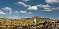 Meisje blikt vanaf de kust nabij El Golfo richting het vulkaangebied Timanfaya op Lanzarote- Canarische Eilanden
