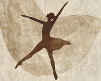 Timeless Dance on Aged Canvas - Dit abstracte schilderij toont een gestileerde silhouet van een ballerina in een klassieke danspose. Het figuur, dat uitgevoerd is in donkerbruine en terracottatinten, contrasteert sterk tegen een achtergrond die veel weg heeft van een verweerd perkament of een oude landkaart. De achtergrond heeft een…