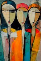 Een abstract schilderij met drie vrouwenfiguren met langgerekte en minimalistische gelaatstrekken. Ze staan dicht op elkaar en stralen een gevoel van eenheid en bezinning uit.