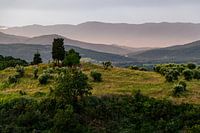 De laatste zonnestralen van de dag kleuren de nevel in de Toscaanse heuvels op de achtergrond.