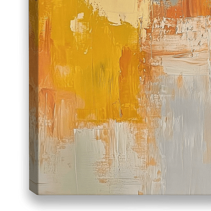 Een levendig abstract kunstwerk met een mix van zachte tinten, de compositie wordt gekenmerkt door gestructureerde penseelstreken en overlappende kleurvlakken die een dynamische visuele aantrekkingskracht creëren. De algehele sfeer is modern en kleurrijk en roept een gevoel van warmte en energie op.