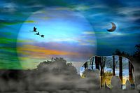 Nachthimmel ueber dem Traumpfad der Elefanten. Illustration, Bild, Dekoration, Leinwand, Blickpunkt, Land, Landschaft, Jahreszeit, Sommer, Nacht, Nachthimmel, Tiere, Vogelflug, 2015