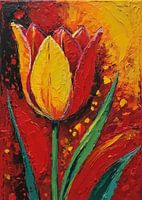 De Triumph-tulp, geschilderd in acryl, is afgebeeld met sierlijke, rechtopstaande bloemblaadjes in gedurfde tinten rood, roze en oranje. De strakke vormen en vloeiende kleurovergangen weerspiegelen de robuuste, klassieke vorm van de bloem. Op canvas biedt deze tulp een evenwichtige compositie die zowel modern als tijdloos is, ideaal om…