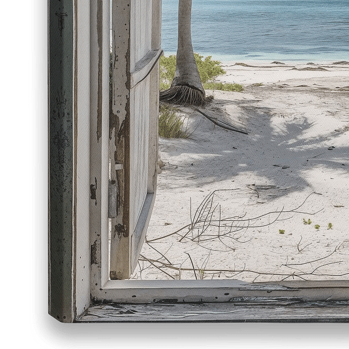 Geniet van het uitzicht op een droomachtig tropisch strand door een open raam. Het turquoise water en de zachte golven, omringd door palmbomen en wit zand, creëren een perfecte sfeer van ontspanning en sereniteit. Ideaal voor strandliefhebbers en mensen die verlangen naar een exotisch uitje. Deze foto brengt een rustgevende en…