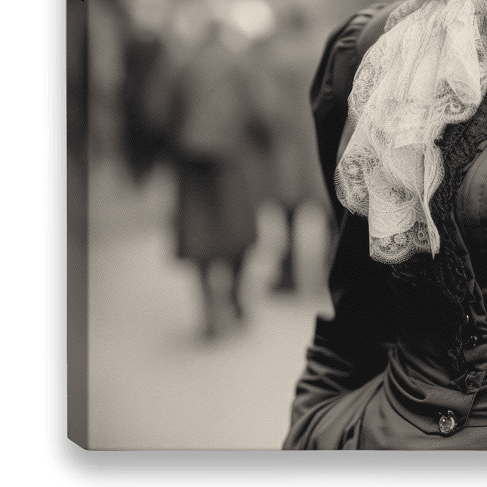 In dit portret straalt de afgebeelde vrouw een bijzondere elegantie en gratie uit die perfect contrasteert met de stedelijke omgeving op de achtergrond. Haar rechte tred en trotse, enigszins afgewende blik laten haar opvallen temidden van de drukke straten. De kunstig versierde hoed met grote bloemen, die haar kapsel benadrukt, geeft…