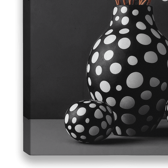 Een stilleven van een zwarte keramische vaas met grote witte stippen, gevuld met witte bloemen, geplaatst op een donkere ondergrond tegen een diep antracietkleurige achtergrond. De sfeer is minimalistisch, elegant en verfijnd.