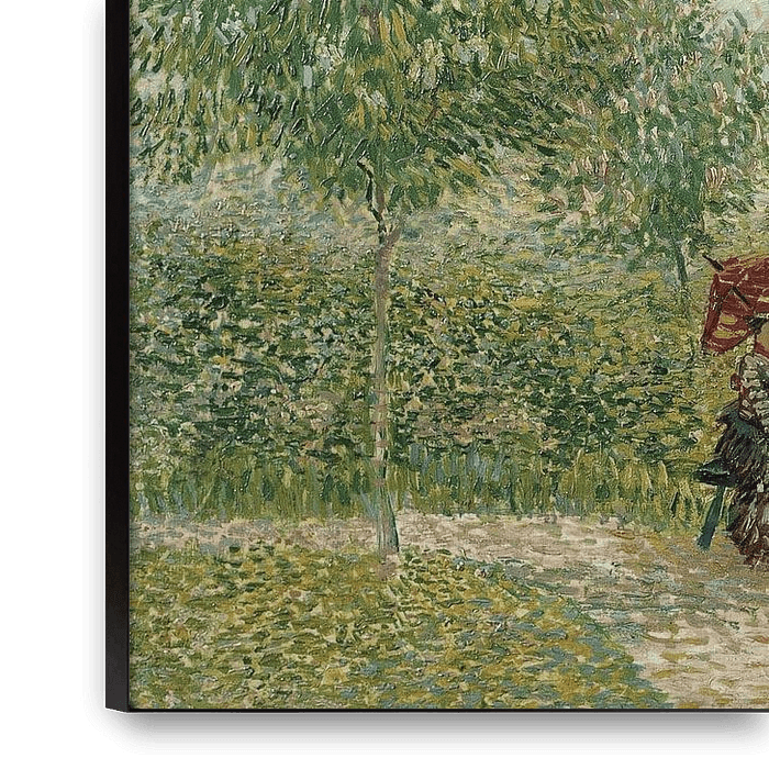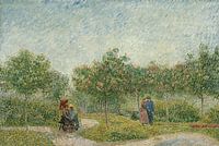 Dit zonnige parkgezicht is een van de grootste doeken die Vincent van Gogh ooit in Parijs maakte. Geïnspireerd door de stippen die Pointillisten gebruikten, gebruikte Van Gogh in plaats daarvan losse kleine verfstrepen. Hij bracht de verf in verschillende richtingen en diktes aan, waardoor elk element - de lucht, de vegetatie en de figuren - zijn eigen specifieke textuur kreeg. Dit hielp hem het effect van een stralende lentedag te creëren, wat paste bij het gevoel van intimiteit en saamhorigheid dat hij wilde uitdrukken.