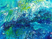 Abstract fluid art schilderij in intense groenblauwe en turquoise tinten. De verf is vloeiend over het oppervlak bewogen, waardoor natuurlijke patronen en kleurovergangen zijn ontstaan.