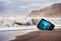 Mijn fotobewerking "Turtle beach" is een surrealistisch kunstwerk dat een warm strand met prachtig strijklicht en branding laat zien. In het zand is een televisie half begraven, waarop het beeld van een schildpad te zien is.