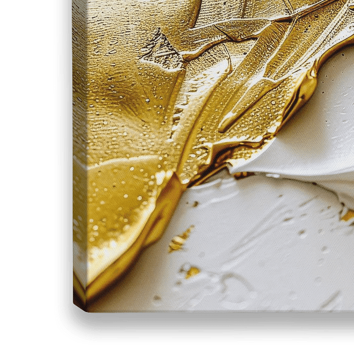 De grove, tastbare lagen van gesso en verf brengen diepte en beweging, terwijl het bladgoud zich als een zachte gloed over het oppervlak vouwt soms helder aanwezig, dan weer haast onzichtbaar.