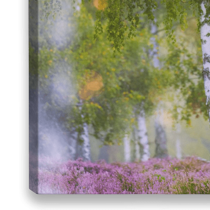 Artistieke foto van een klein berkenbosje in bloeiende heide.