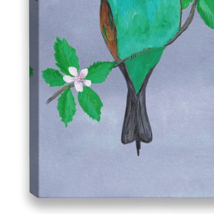 Een acryl inkt schilderij van twee bijeneters die op een tak met blaadjes en roze bloesem zitten. ze zitten in een rustige positie en kijken allebei naar links.