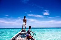 Koop de foto Twee jonge vissers op zoek naar visvangst in de tropen van André van Bel op canvas, aluminium dibond, (ingelijste) fotoprint, behang en ArtFrame, op maat geprint in Fine-Art kwaliteit.