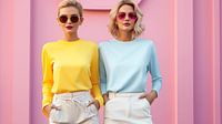 Twee jonge vrouwen met zonnebril in kleurrijke kleding met roze achtergrond in pop-art design