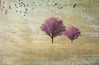 Minimalisme ten top. Leeg landschap met slechts 2 bomen die prachtig in bloei staan en de volle aandacht opeisen. Daarboven een vlucht vogels.