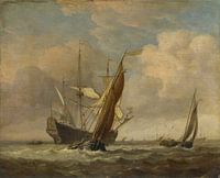 Twee kleine schepen en een Nederlands oorlogsschip in een briesje, Willem van de Velde