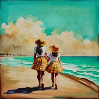 Twee jonge meisjes wandelen langs een winderig strand, hun aanwezigheid is levendig en onmiskenbaar tegen de gedempte tinten van de zee en het zand. Hun breedgerande hoeden hellen een beetje over, waardoor ze de warme gloed van het zonlicht vangen, en hun jurken - spetters van gedurfde, vrolijke kleuren - wapperen fijntjes in de…