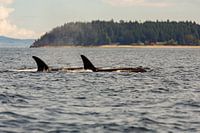 Voorbij zwemmede orka's in de oceaan bij Canada, twee rugvinnen komen uit het water.