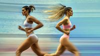 Deze dynamische illustratie toont twee krachtige vrouwelijke atleten die zij aan zij sprinten op een atletiekbaan. Hun snelheid en kracht worden benadrukt door een dynamisch onscherpeffect dat hun vastberadenheid en competitieve geest weergeeft.