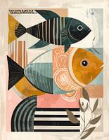 Vissen in goud oker blauw roze en aarde tinten. Expressionistisch kunstwerk met geometrische vormen. uitgewerkt in een uitgebalanceerde collage zodat een rustig geheel ontstaat