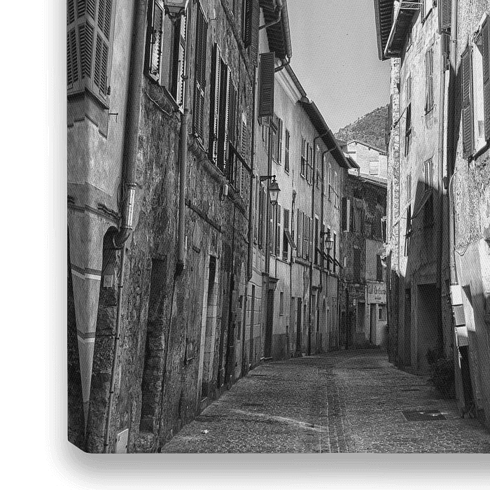 Zwart-wit foto van een leeg authentiek straatje in het Zuid-Franse Sospel.