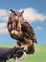 Zeer scherpe foto van een roofvogel met zijn prooi in zijn mond. Mooi zacht achtergrond met gras en een blauwe lucht.