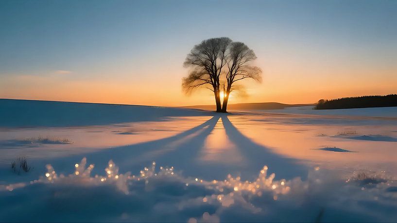 Een breed, besneeuwd veld spreidt zich uit voor de kijker, het oppervlak fijn gestructureerd door wind en oude sporen die zachtjes vervagen in de ondiepe zonsondergang. Het licht valt warm: gouden en oranje tinten steken boven de horizon uit en ontmoeten de koele blauwe en lavendelkleurige tinten van de lucht, waardoor een delicate,…