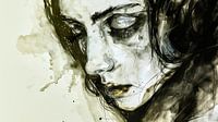 Deze indrukwekkende illustratie toont een vrouw met donker haar die naar beneden kijkt met een uitdrukking van diepe droefheid. Haar gezicht is lichtjes naar één kant gekanteld en haar ogen zijn halfgesloten, alsof ze in gedachten verzonken is. De fijne lijnen en arceringen in de illustratie benadrukken haar zachte gelaatstrekken en…