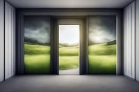 Dit betoverende kunstwerk toont een open deur omgeven door een weelderig groen landschap en nodigt bezoekers uit voor een indrukwekkend huis met majestueuze architectuur en heldere ramen in de wolken. Het is gemaakt met generatieve AI en straalt een uitnodigende aura uit die tot de verbeelding spreekt.