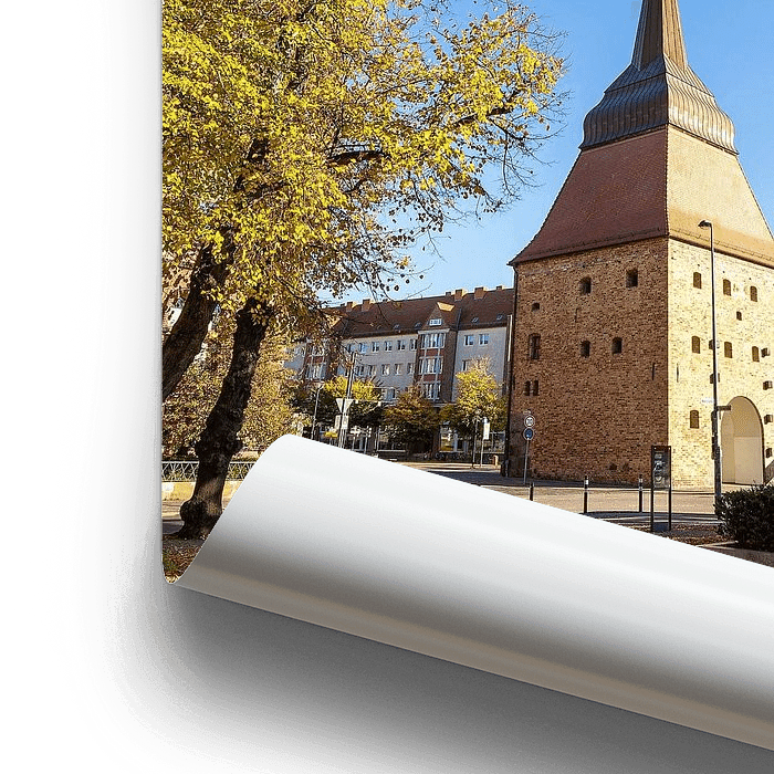 Koop de foto Uitzicht op de Steintor in de Hanzestad Rostock in de herfst van Rico Ködder op canvas, aluminium dibond, (ingelijste) fotoprint, behang en ArtFrame, op maat geprint in Fine-Art kwaliteit.
