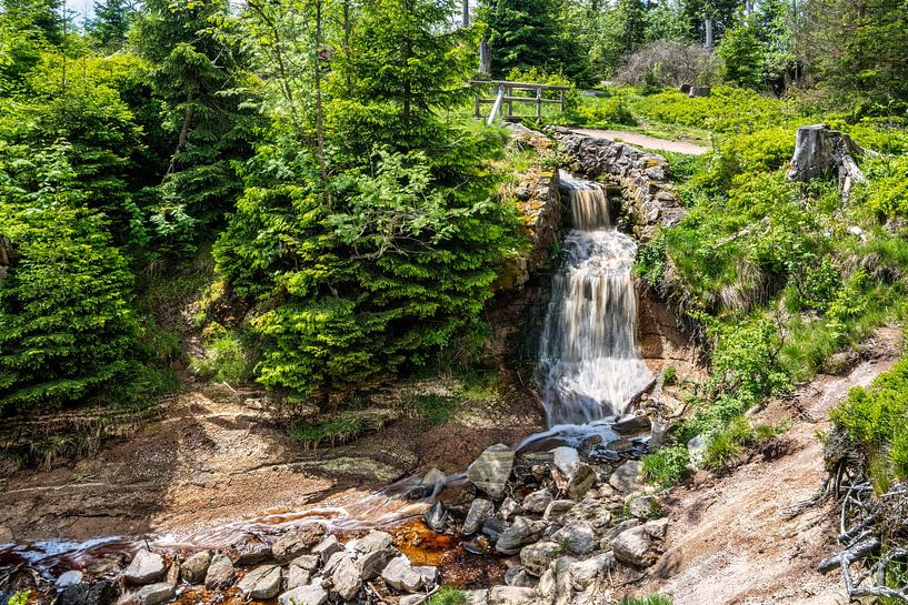 Uitzicht op de waterval bij de Oderteich vijver in het Harz gebergte in Duitsland