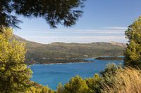 Een mooie zomerse dag in de Provence, Frankrijk. Eén van de vele uitzichtpunten op het prachtige Lac de Sainte-Croix. De begroeiing op de voorgrond is gebruikt als natuurlijk doorkijkje, waardoor er meer diepte in de foto ontstaat.