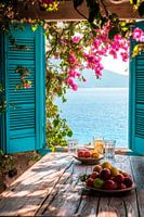 Een raamkozijn in helder turkoois biedt een betoverend uitzicht op zachte golven en bloeiende bougainville. Een rustieke houten tafel met een kleurrijk arrangement van fruit en verfrissende drankjes nodigt je uit om te ontspannen. De geur van de natuur en het spel van licht en schaduw geven het moment een onvergetelijke lichtheid.