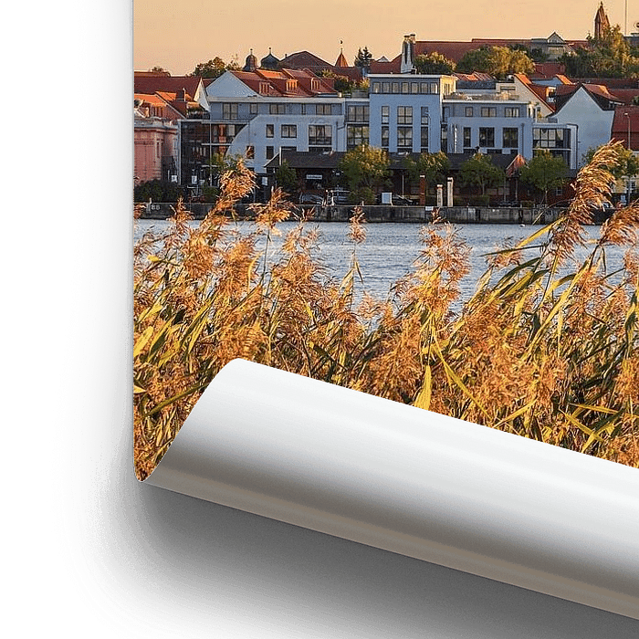 Koop de foto Uitzicht over de Warnow naar de Hanzestad Rostock in de avond van Rico Ködder op canvas, aluminium dibond, (ingelijste) fotoprint, behang en ArtFrame, op maat geprint in Fine-Art kwaliteit.