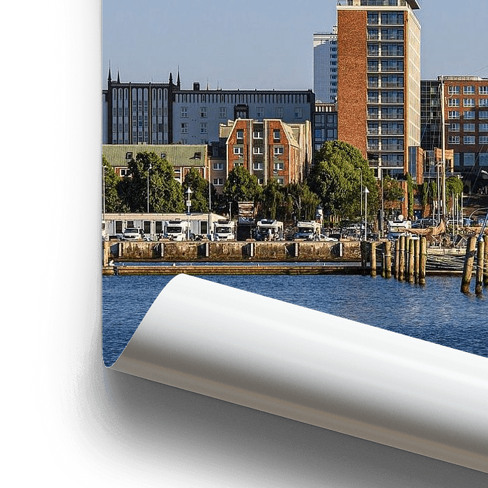 Koop de foto Uitzicht over de Warnow naar de Hanzestad Rostock van Rico Ködder op canvas, aluminium dibond, (ingelijste) fotoprint, behang en ArtFrame, op maat geprint in Fine-Art kwaliteit.