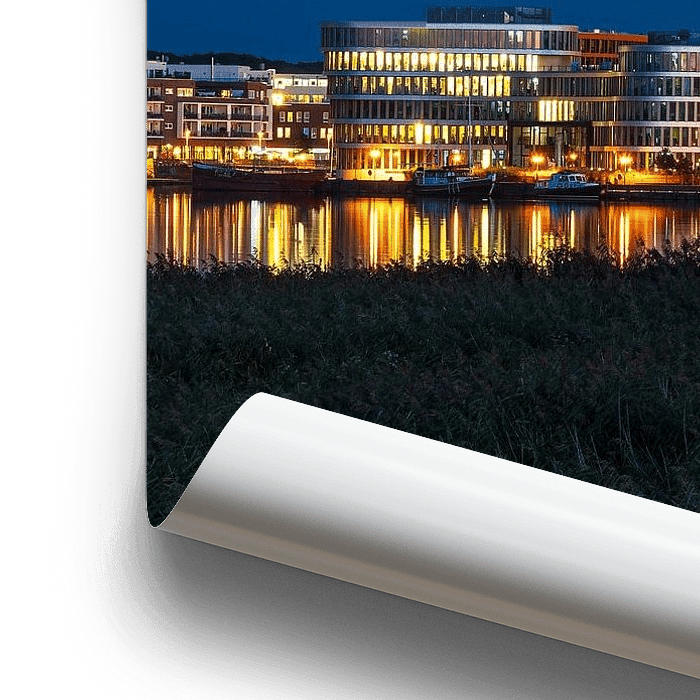Koop de foto Uitzicht over de Warnow richting de Hanzestad Rostock in de avond van Rico Ködder op canvas, aluminium dibond, (ingelijste) fotoprint, behang en ArtFrame, op maat geprint in Fine-Art kwaliteit.