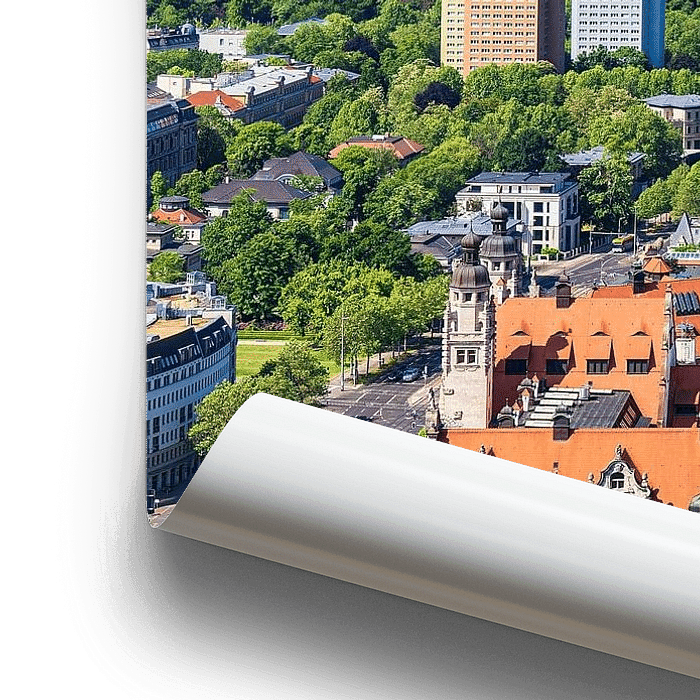 Koop de foto Uitzicht over de stad Leipzig met het nieuwe stadhuis van Rico Ködder op canvas, aluminium dibond, (ingelijste) fotoprint, behang en ArtFrame, op maat geprint in Fine-Art kwaliteit.