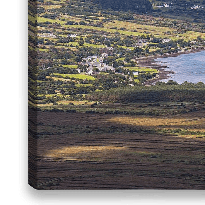 Uitzicht vanaf de Conor Pass of Connor Pass is een van de hoogste Ierse bergpassen die wordt bediend door een geasfalteerde weg. Het bevindt zich aan de weg R560 in County Kerry, Ierland. Het uitzicht is hier richting het dorp Cloghane.