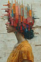 Details: portret, vrouw, abstract, stadsgezicht, modern, canvas, kunst, rood, blauw, oranje