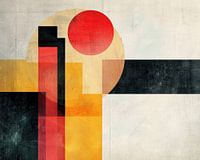 Urban Sunrise - Dit abstracte schilderij kenmerkt zich door grote geometrische vormen in rood, zwart, geel en wit, met een dominante rode cirkel en een prominente verticale en horizontale zwart-witte baan die snijdt door de canvas.
