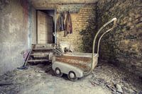 Een hele oude kinderwagen in een vervallen en verlaten huisje.