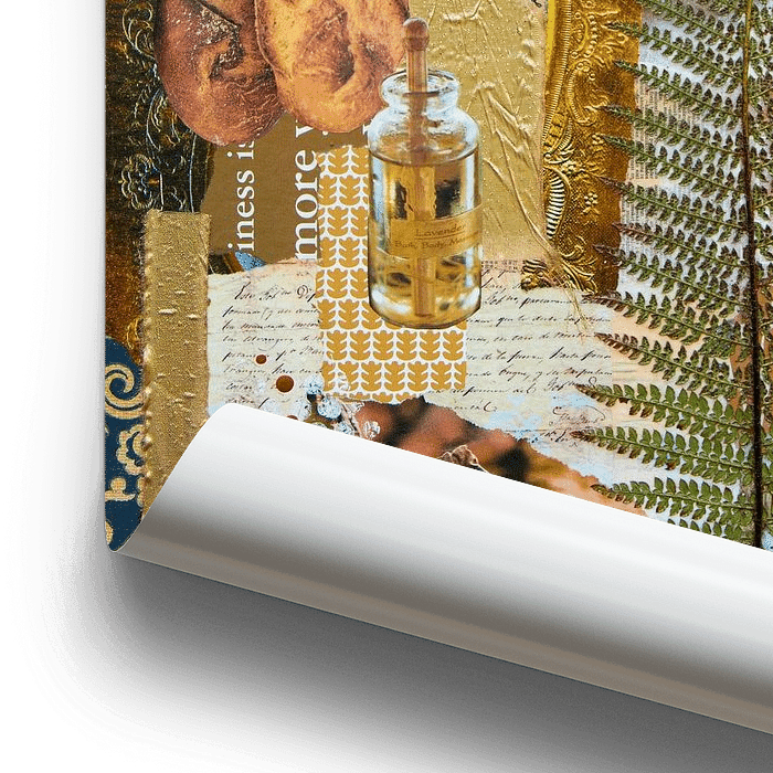 Analoge collage van papier en textiel (goud), dus niet op een computer samengesteld. Plaatje voor plaatje, snipper voor snipper bij elkaar gezocht. Knippen, scheuren, schuiven en uiteindelijk op een…