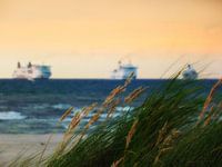 Veerboten op weg naar Warnemuende, Rostock,Duitsland met op de voorgrond een stukje strand en grassen.
