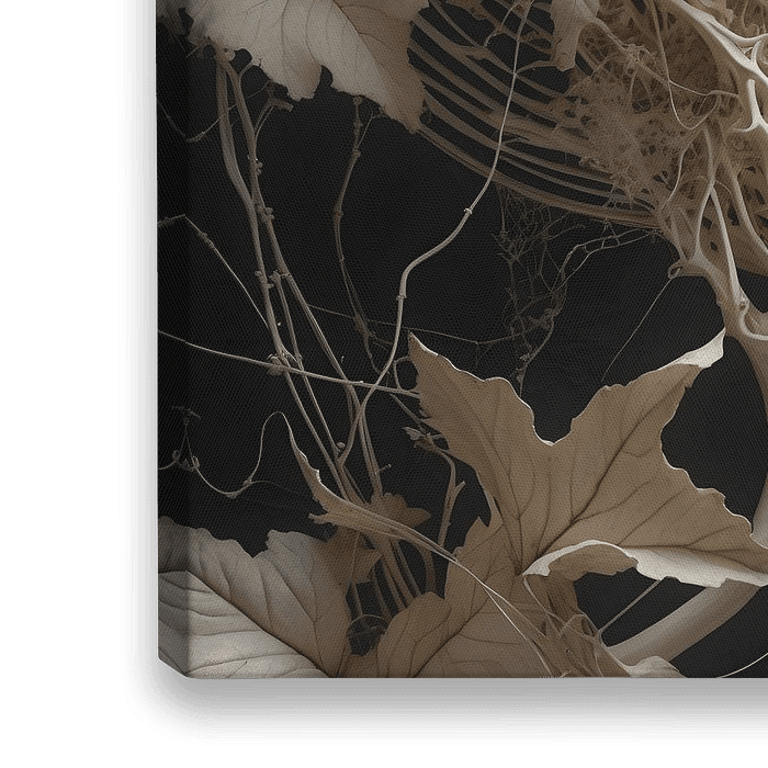 Veins of Decay – Organische Herfstkunst is een intrigerend en poëtisch werk dat het vergankelijke van de natuur op een elegante en bijna buitenaardse wijze verbeeldt. De fijne nerven van verwelkte bladeren verstrengelen zich met delicate spinnenwebstructuren, die haast als kant lijken geweven over een diepzwarte achtergrond. Deze compositie ademt een verstilde schoonheid, waar de grens tussen verval en verfijning vervaagt.